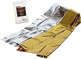 【エマージェンシーブランケット】 レスキューシート、アルミブランケット 価格: 400円 レビュー評価:5.0 レビュー数:1 ■災害と悪天候が重なったら、時と場所を選ばない寒さや雨から身をまもるためのエマージェンシーブランケットです。■保温する特殊な素材を使用しているため、薄手なのにあたたかく、水もとおしません。■畳めばコンパクトサイズなので、邪魔になりません。■体温保持率が90%で、耐熱・防水加工が施されております。 サイズ:135cm×210cm(広げた時)12cm×約7cm(畳んだ時) 重量:47グラム 材質:アルミ蒸着ポリエステル ※大人でも楽に包み込むことが出来ます。防水、耐水、保温できるマット。体温低下を防ぐだけでは無く